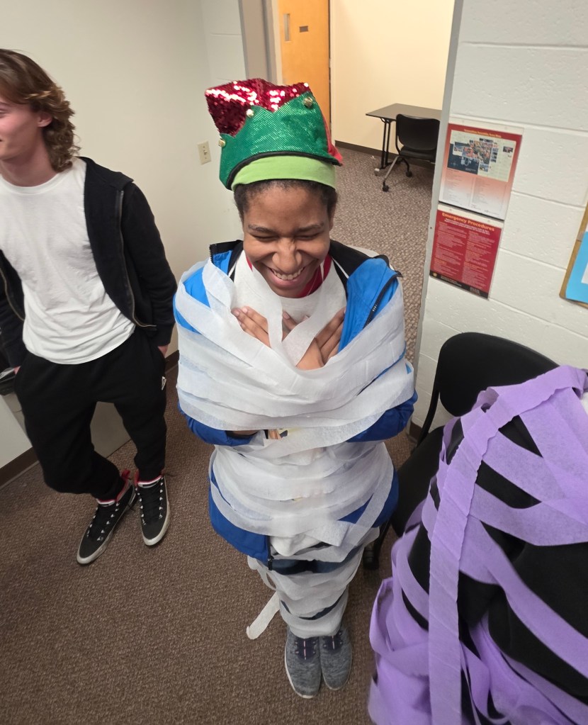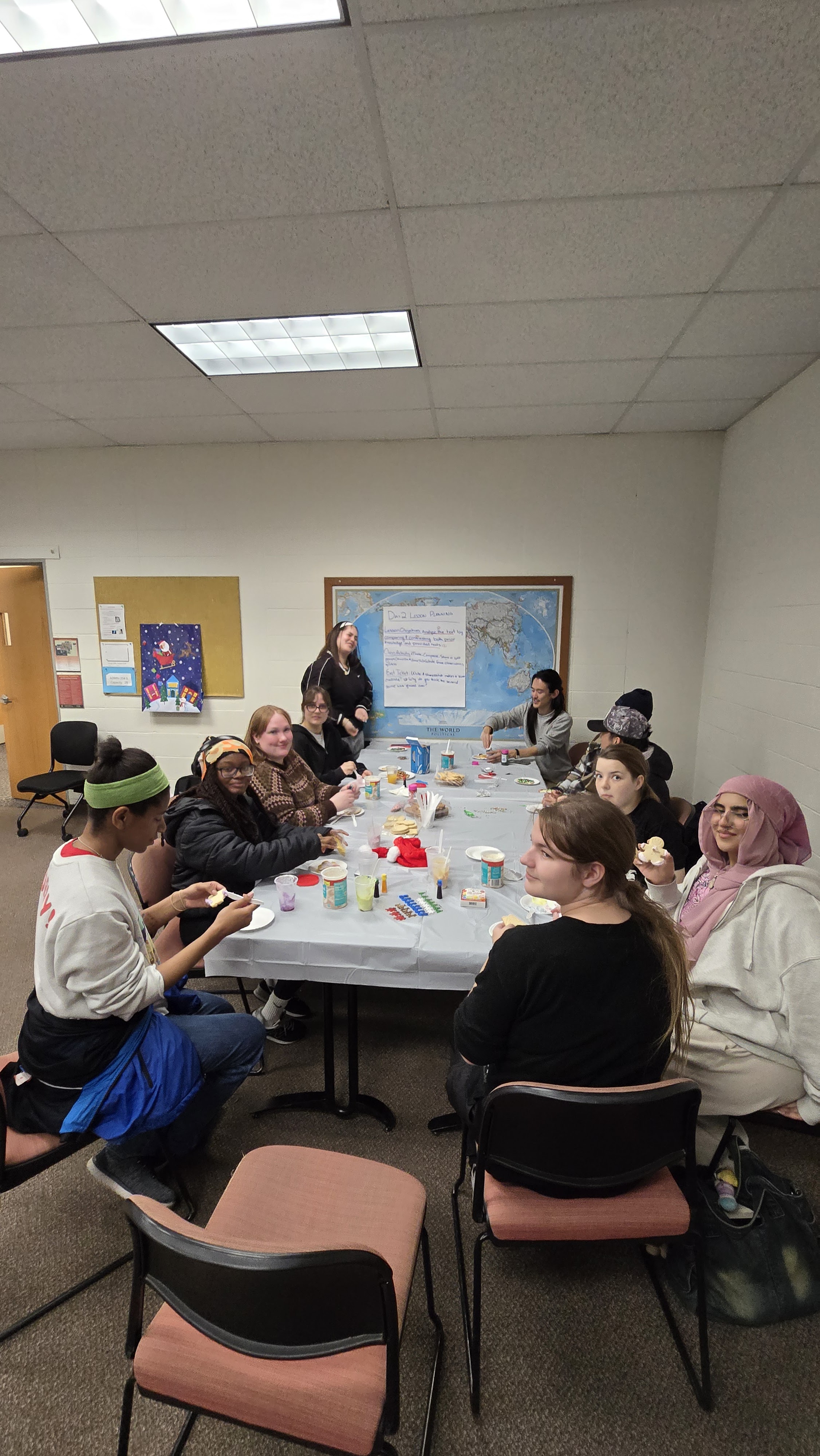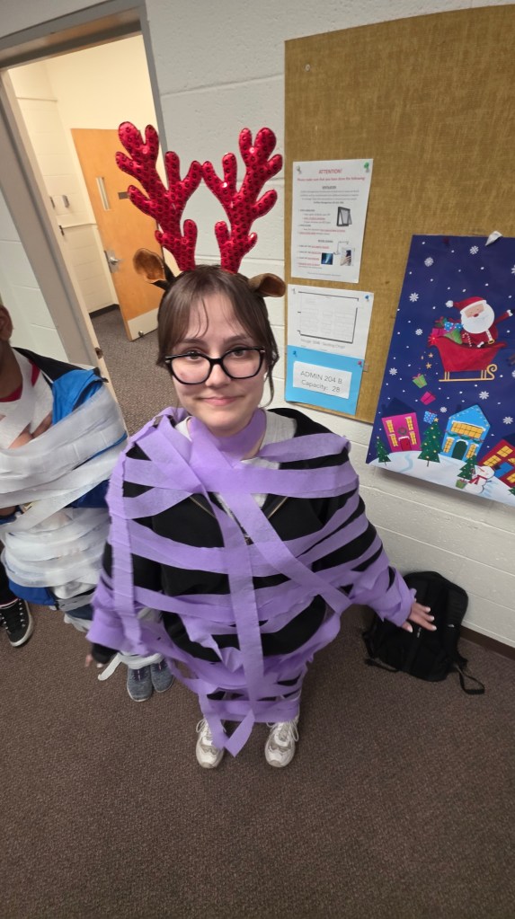 Students started showing up and we greeted everyone. We waited till it seemed like there weren’t more people coming and welcomed everyone, and talked about what Intervarsity is. Then we did two ice breaker games that were so funny. The first one was wrapping the bible study leaders in streamers like a tree and then you had to put on a Santa hat. The first one to be done won. The next game was we had to put a Santa hat sticker as close to Santa’s hat as possible. There was a poster and everyone on that team had to spin around and then walk blindfolded to the poster. People on their team had to shout at them where to go, then the other team was giving the wrong directions. It was great fun but super disorienting. When it was my turn there were so may voices it was so hard to focus and hear my team member’s giving me directions. Then we had food and decorated sugar cookies. We hung out for a while after the party was over and the students helped clean up. It was so fun, what a way to end the year. We won’t have bible studies until next year starting in February.